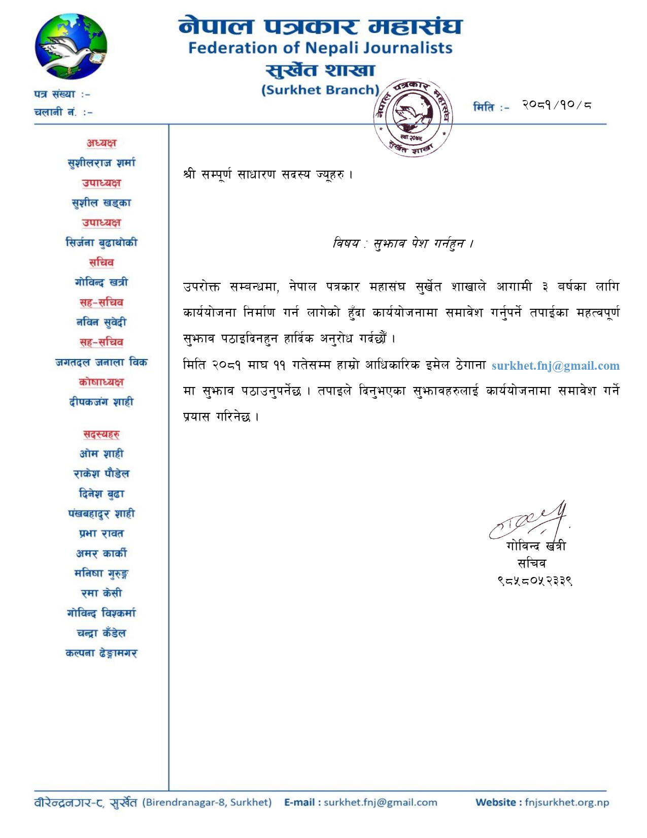 कार्ययाेजनाका लागि सुझाव पठाउनहुन हार्दिक अनुराेध छ ।